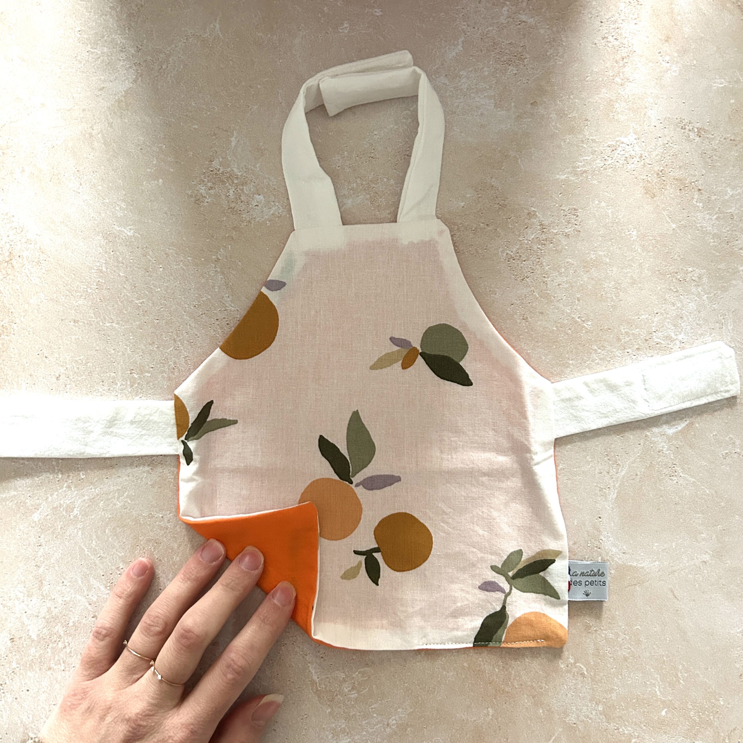 Lavage en machine du tablier à 30°C. Utilisation du sèche linge déconseillé. Pas de repassage.