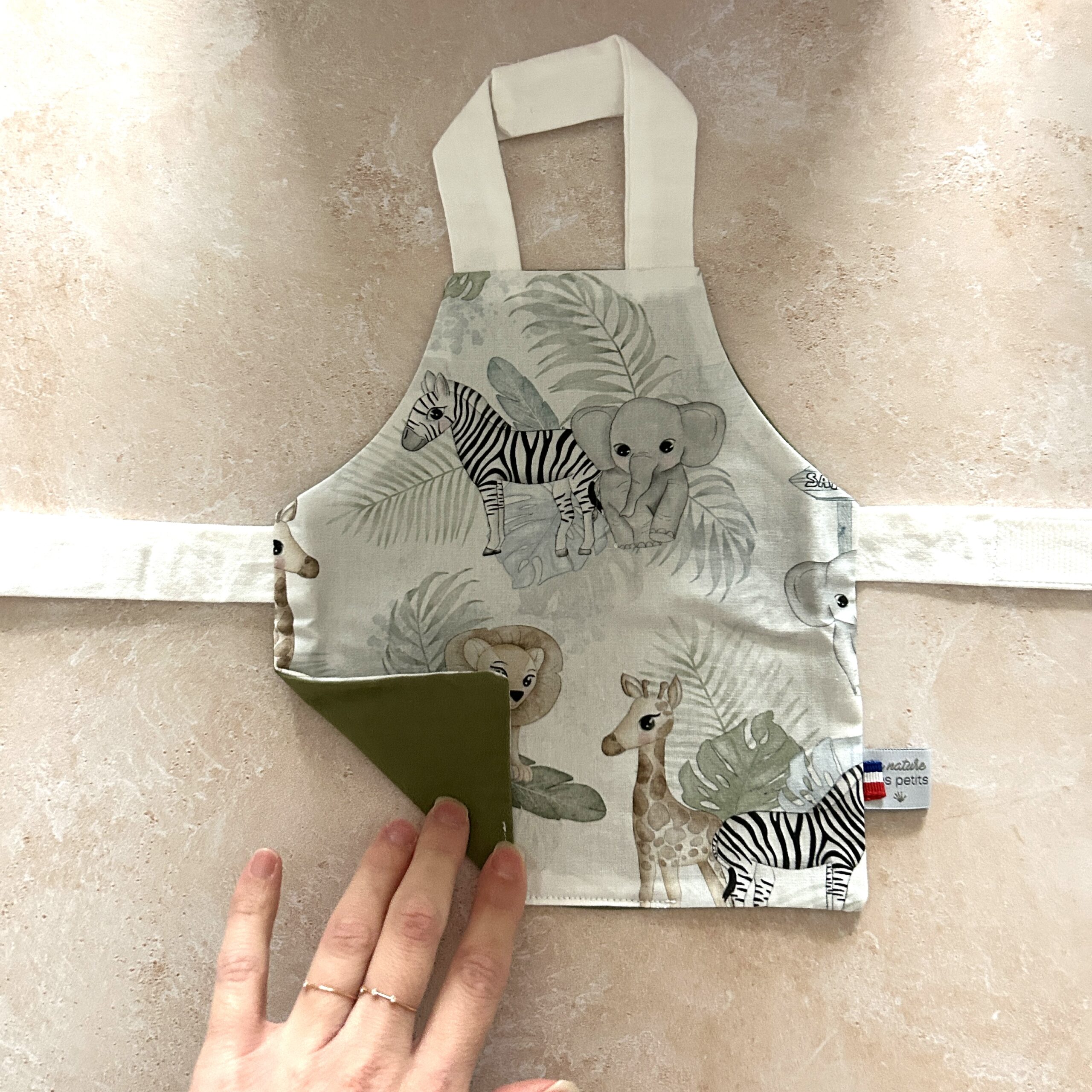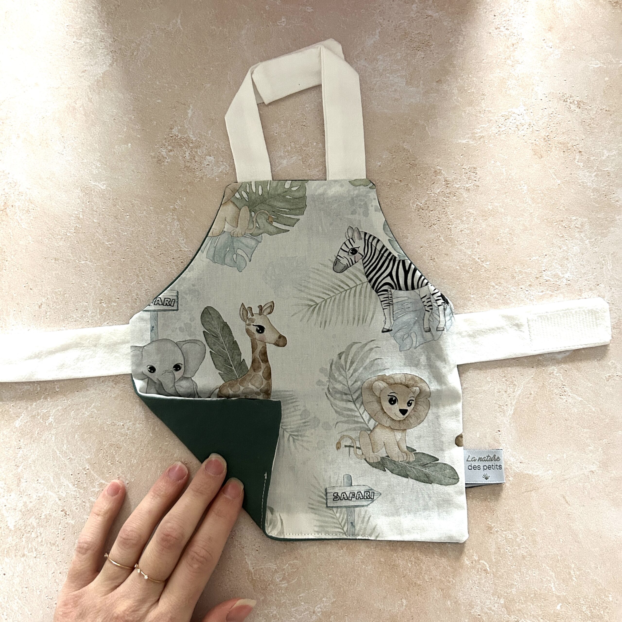 Tablier de poupée réversible qui peut être assorti au tablier de cuisine de votre enfant. Cette création est un jeu d’imitation que les enfants adorent. Vous pouvez choisir la couleur du verso : jade, olive ou thym. pour une poupée de 45 cm.